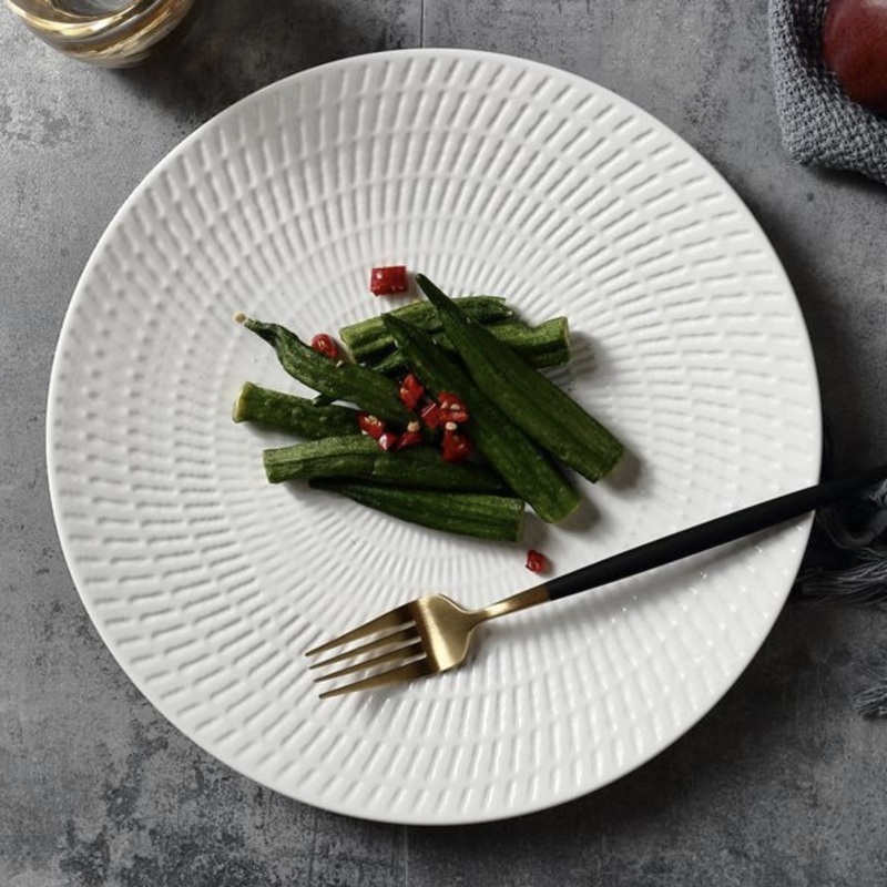 The Ceramic White Dinner Plate is handcrafted and textured. It’s made with neat strokes etched onto its surface to give it texture and make for a classic dining experience.