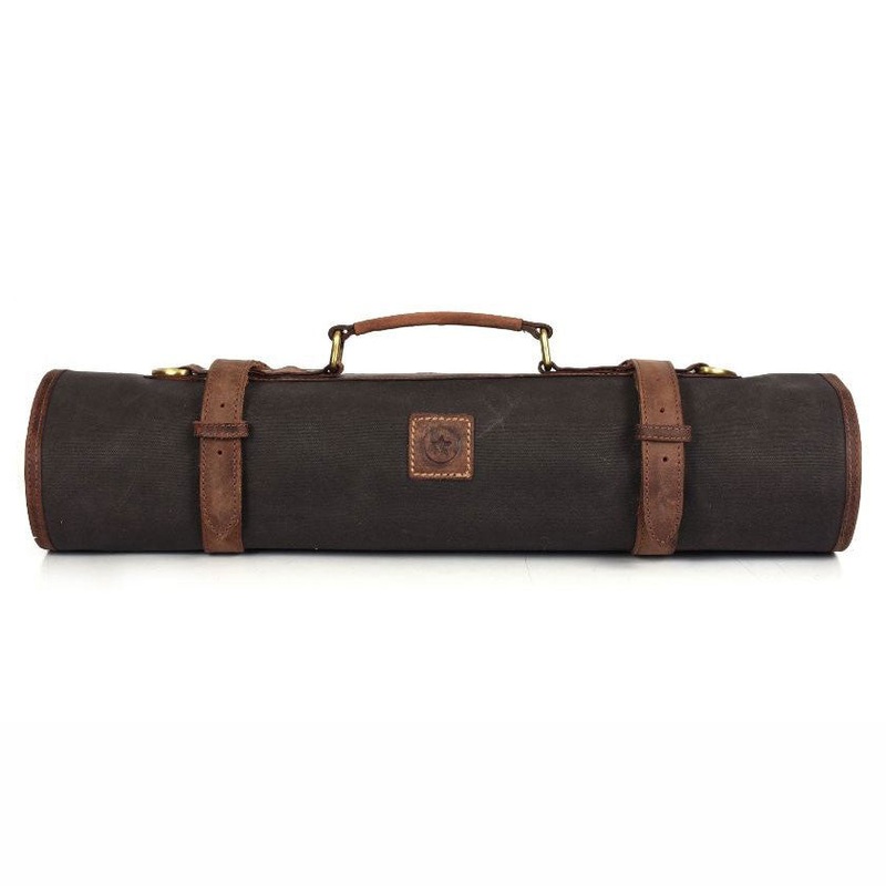 These 14-slot knife bags are designed to store up to 14 kitchen knives and tools up to 300mm (11.8″) in length with a wooden sheath along with other accessories. Handcrafted from a premium quality high density waxed canvas and stitched by skilled craftsmen. 2 classy buckles closure form a tight roll along with a 2″ wide webbed shoulder strap for ease in carrying the knife bag. The metal buckle closure is corrosion-free and renders a vintage appeal. 10 elastic rubber knife pockets hold knives tightly and 4 leather studded pockets accommodate small chef tools. The interior also has a long zippered compartment on the corner to fit kitchen miscellany such as spatulas, thermometers, bench scrapers, pens, etc. also to keep intact knives and tools.