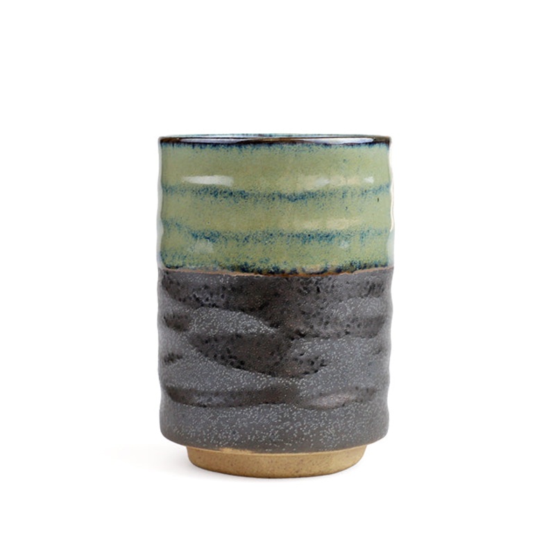 Featuring a stunning dual-tone glaze with a soothing moss green with subtle blue accents and a rich charcoal black with a textured, wavy pattern, this sushi Yunomi evokes the natural harmony of land and sea.