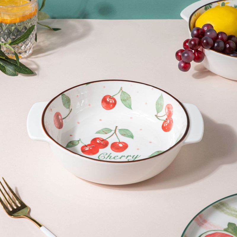 The ceramic bowl with handle features patterns of bright red cherries on a white surface in the interior while the exterior surface is stark white. The handles enable easier functionality of the bowl, whether it’s for serving or placing in the oven. The tropical patterned bowl will beautifully brighten up the table setup with its presence.