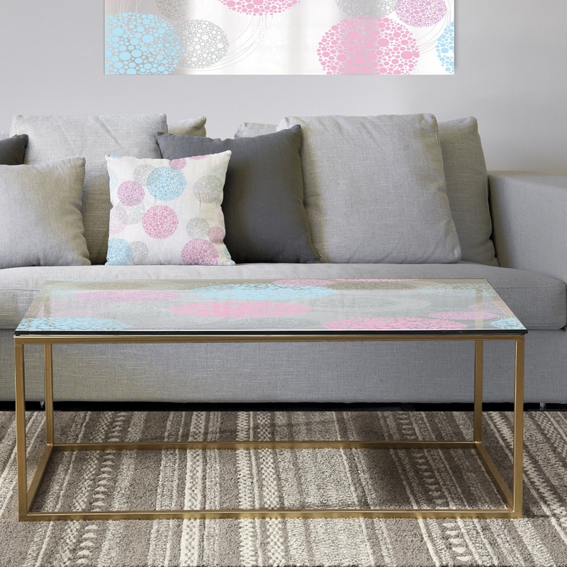 Bring abstract fun into your living room with this Designart coffee table. Circular pink, blue, and grey designs printed beneath this table’s glass top give it an artistic flair, while its sleek, metal frame makes it look open and airy. A goldtone finish completes this table’s glamorous aura, and its sled base keeps it steady.
