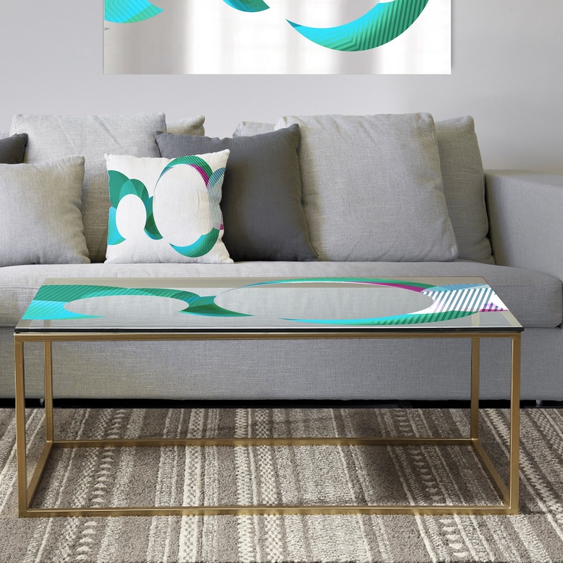 Enhance your living or family room decor with this linear, mid-century modern coffee table featuring an elegant ‘Circular Lacuna 15’ pattern printed under the glass top for longevity. The goldtone base with a textured finish adds to this accent table’s visual appeal. This coffee table boasts a sturdy metal frame construction for stability and durability.