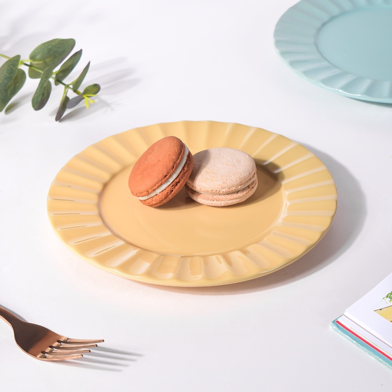Nestip: The ribbed Claramay ceramic plate can be used as a perfect housewarming gift when paired with a yellow-colored dinner set.
