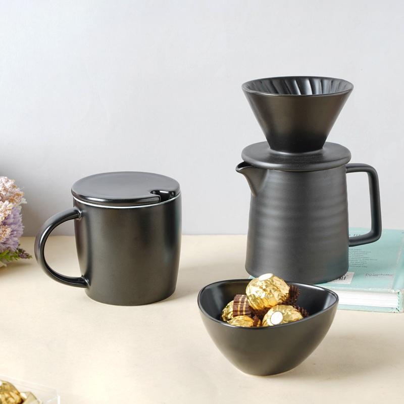 The Coffee First Gift Set in all black consisting of a teapot, a coffee mug, and a snack bowl is the perfect gift for a brother, sister, friend or sister-in-law. There is no one who doesn’t like the classic shade of black becauseit goes well with all dining table setups andis super fun to experiment with. The thoughtful gift will gather for you the love and appreciation of your dear ones for there is no one in the entire world who doesn’t like a gift of modern coffee mugs and ceramicware.
