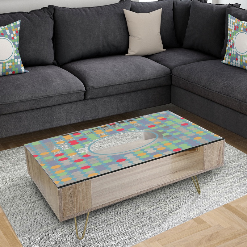 Liven up your living room with this modern coffee table. Sitting on sturdy hairpin legs, this spacious table, with its open shelf and generous, glass top, offers ample space for magazines and your coffee cup. Patterns of colored hexagons on blue, printed in high-density Italian inks beneath the glass top, give your room an artistic makeover.
