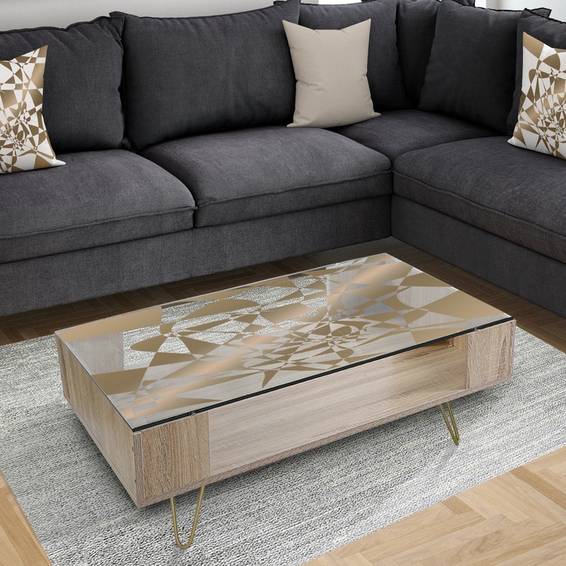 Combine abstract art and functional furniture when adding this mid-century modern coffee table to your design mix. A coppertone print applied to the underside of the clear glass tabletop instills visual interest, while hairpin metal legs complement the artwork and stabilize the table.