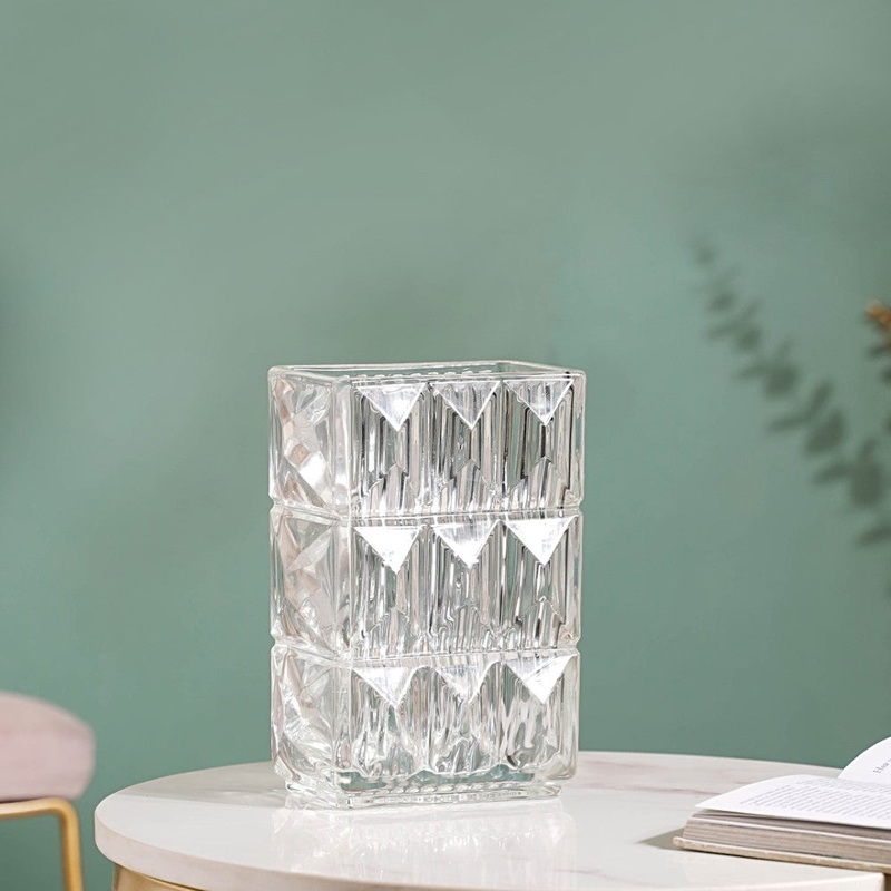 Elevate the home decor with the exceptionally designed glass vase, a rare and unique addition to any living space. This stunning vase features a contemporary design with ribbed and diamond textures, giving the flower vase a crystallised form. Whether one chooses to display it as a contemporary showpiece or adorn it with fresh or faux flowers, the decorative vase is sure to catch the eye of anyone who enters the room. The glass vase is the ideal size to be placed in various corners of your living room, dining area, or bedroom. The flower vase has sturdy glass build that provides stability, ensuring that the flowers or branches remain securely in place.