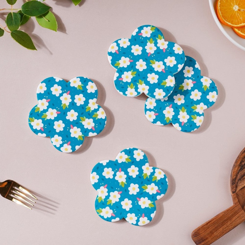 In a meadow of lush blue, the daisies are framed aesthetically in a coaster. The flower-shaped coaster is an eclectic addition to any table decor. The coaster is an effective tool to save the surface of the table from stains, especially when the surface is made of glass.