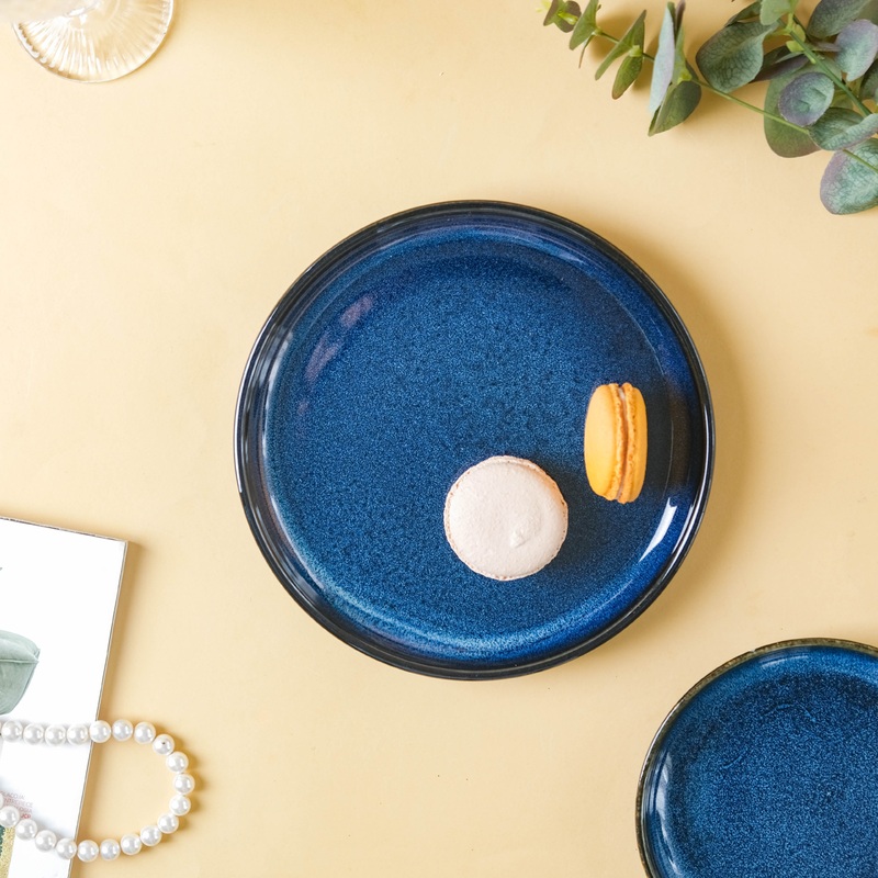 The round gorgeous blue plate with a dark rim is ideal for serving sandwiches and appetizers. The blue plate has an elegant and slim design that is delicate looking and it is very durable. The snack plate can be used to add a pop of color to a neutral dinner table setting. The dinner plate is a stylish addition to festive dinner parties.