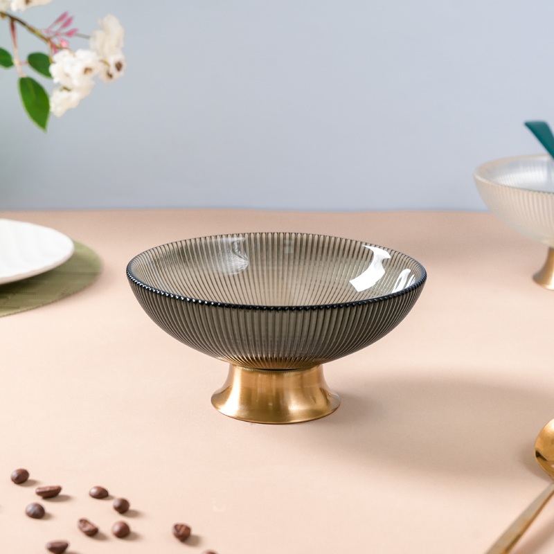 The stand has a lustrous golden base and a grey tinted bowl top with a ribbed texture. The bowl with its raised base may be used to place vibrant colorful fruits, an array of freshly baked cookies, and cupcakes. Place it as the centerpiece of the dining table or use it to present the food, you want to be the highlight during a party.