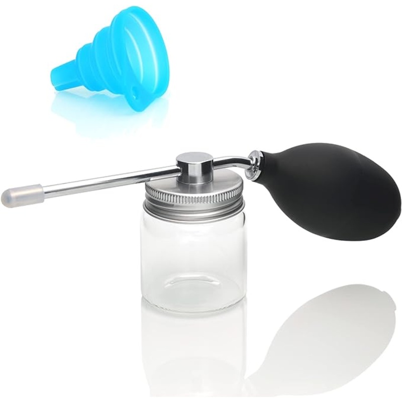 Quality MaterialThick and sturdy rubber bulb, yet easy to compress. High hardness clear glass makes it easy to see the amount of powder in the container. |