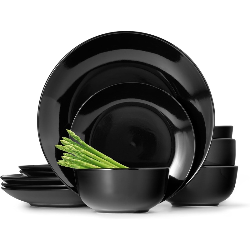 Dinnerware Sets, Fine Porcelain Dinnerware Sets, Plates and Bowls Sets, Dishes, 12-Piece Service for 4, Black