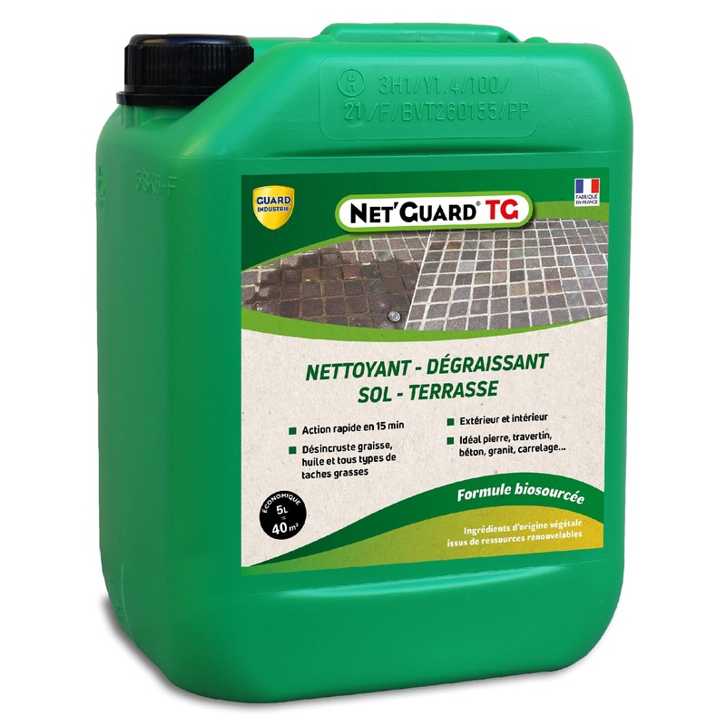 GUARD INDUSTRIE, EXPERT IN MATERIAL CARE: Guard Industrie offers ecological and innovative products to clean, protect, and beautify your materials, combining chemistry and the environment. Limestone, marble, granite, slate, tiles, concrete, cement, tiles, bricks, terracotta, Guard Industrie supports you in the maintenance of all your materials. DIRECTIONS FOR USE: Apply with a sprayer, roller, or brush. Ready to use. Apply generously to the floor. A classic brush broom can further improve effectiveness. Leave for 30 to 60 minutes depending on the level of dirt. Rinse with a high-pressure cleaner using cold or hot water for increased effectiveness. ALL EXTERIOR AND INTERIOR STONE: tiles, travertine, marble, granite, concrete, terracotta, paving stones, and composite wood. More than 90 biodegradable. WORKS IN 30 MINUTES: Powerful action from 30 minutes thanks to a new formula based on rapeseed, sunflower, canola and soy which gives it its descaling power on all stone and even porcelain stoneware and composite wood. READY-TO-USE GREASE AND DIRT DESCALING CLEANER PLANT-BASED: cleans all natural stone or concrete floors dirty with grease, mineral or food oil, pollution or any encrusted dirt. Bio-sourced product from biomass.GUARD INDUSTRIE, EXPERT DANS LE SOIN DES MATRIAUX : Guard Industrie propose des produits cologiques et innovants pour nettoyer, protger et embellir vos matriaux et allier chimie et environnement. Pierre calcaire, marbre, granit, ardoise, tuiles, bton, ciment, carrelage, briques, terre cuite, Guard Industrie vous accompagne dans l’entretien de tous vos matriaux. CONSEIL D’UTILISATION : s’applique au pulvrisateur, rouleau, pinceau. Prt l’emploi. Appliquer gnreusement sur le sol. Un balai brosse classique peut amliorer encore l’efficacit. Laisser 30 60 minutes selon l’encrassement. Rincer au nettoyeur haute pression eau froide ou chaude pour une efficacit accrue. TOUTE PIERRE EXERIEUR ET INTERIEUR : carrelage, travertin, marbre, granit, bton, terre cuite, pav et bois composite. Biodgradable plus de 90 . AGIT EN 30 MINUTES : Action puissante ds 30 minutes grce une nouvelle formule base de colza, tournesol, canola et soja qui lui donne son pouvoir dsincrustant sur toute pierre et mme le grs crame et bois composite. NETTOYANT DESINCRUSTANT GRAISSE ET SALETE PRET A L’EMPLOI ORIGINE VEGETALE: nettoie tous les sols en pierre naturelle ou bton encrasss par la graisse, l’huile minrale ou alimentaire, la pollution ou toute salet incruste. Produit biosourc issu de la biomasse.