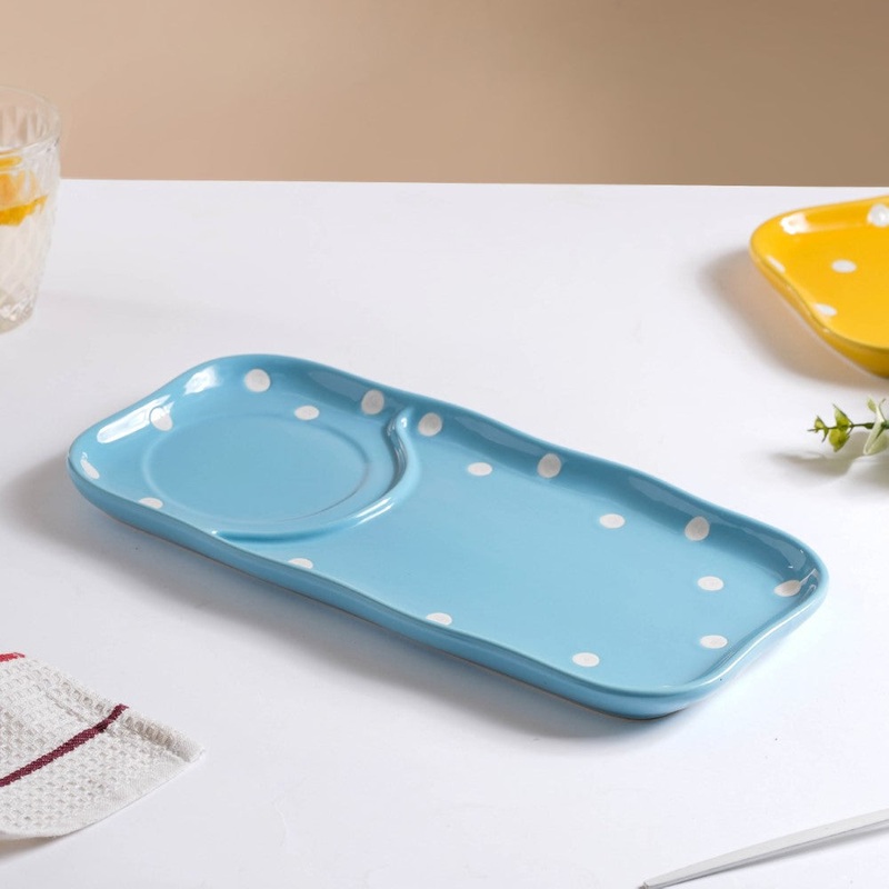 Although soup bowls just need a soup spoon as a company, but what about the extra croutons you want to relish, or keeping the soup spoon somewhere without making a mess. The blue polka dots long soup plate will surely help in fulfilling the purpose. With a circular impression on its surface, the plate can perfectly hold a soup bowl along with some crackers, croutons, and garlic bread on the side. The soup plate is meant to spread vibrance on the table as a housewarming or festive gift.