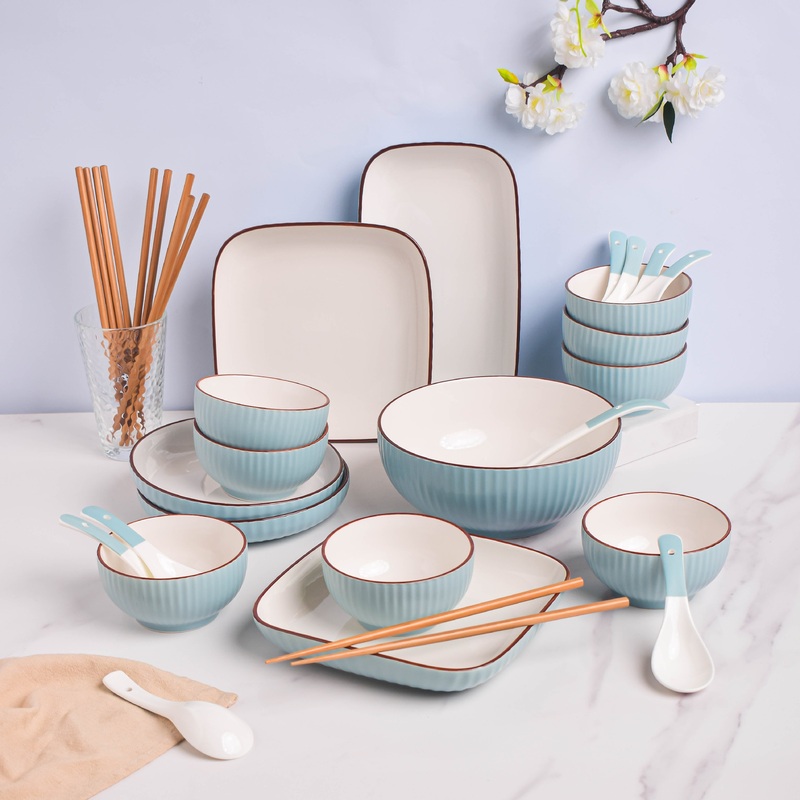 Spruce up the dining table with the light blue dinner set which is embellished with slight textures and a contrasting brown border. the neutral shade can blend in any uber-chic home. This dinner set is a great addition for a family of eight. One can serve macaroni, pasta, continental food, and the Mediterranean in this ceramic set or use it as a snack set for soups and starters. The reusable chopsticks can be used while serving Korean or any Asian cuisine such as momos, dim sums, sushi, ramen, or noodles.