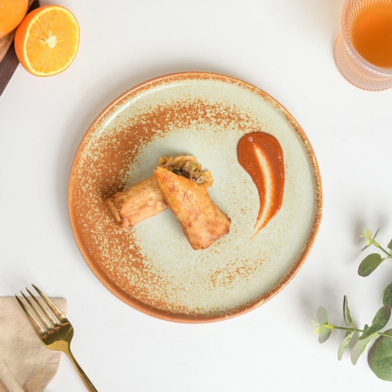 The round snack plate with rustic shades of brown and beige against the white hue can be used for serving an array of appetizers, snacks and munchies. One can serve tea time snacks, starters, small portions of meals or can use the ceramic plates as platters. Spray painted brown speckles on the rustic off-white plate can give a chic vibe to any table setting. The snack plate are microwave, oven and dishwasher safe.