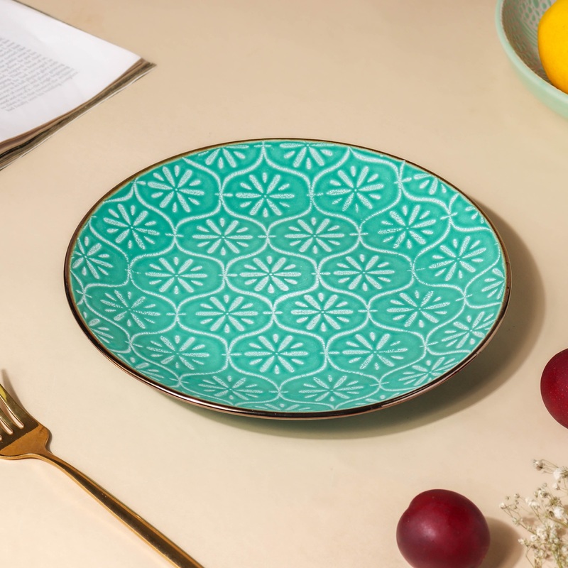 The cloris mosaic gloss-coated snack plate in modern turquoise and ceramic tones would mix seamlessly with any contemporary table setting. The green snack plate is decorated with patterns of fun, festival and endless joy, that will be served with every serving of the plate. The mosaic is added to the name because of the glossy finish on the ceramic snack plate, which is meticulously created by master artisans. The cloris fiesta green ceramic plate can be used to serve a variety of appetizers and sweet treats. It can be utilized as a bread or rice plate if the quantity consumed is minimal.
