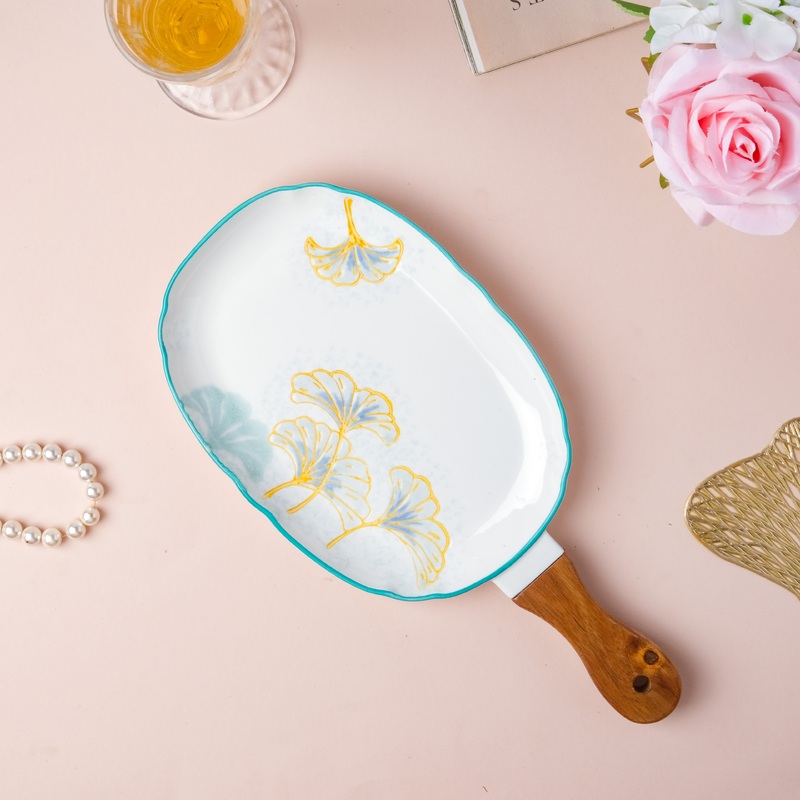 The sleek rectangular tray with a handle brings along an aesthetic that is contrasting yet modern in nature. The rectangular plate comes in the shape of a ceramic white tray with floral patterns on it. The classic color tones of the serving plate enable it to enliven a table setting. The ceramic tray can be used for serving sides, snacks, rice, bread, and even desserts.