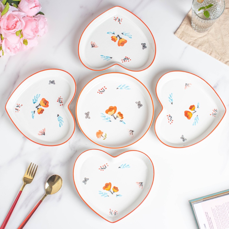A set of five ceramic plates in minimal floral design is great for adding an element of quirk to the everyday table setting. The plates can be served individually or they can be artistically placed together to serve snacks, fruits and more. Four plates in the set are heart shaped while one is a round plate. The plates also add a pop of color to the table and makes it look stylish and attractive.