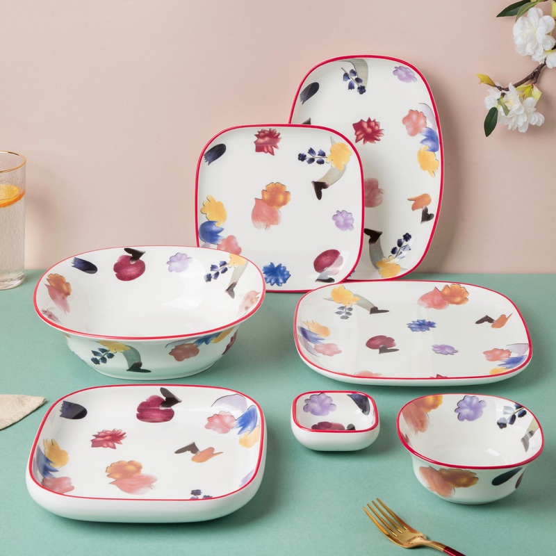 Flowers have always been the center of aromatic freshness and modest gifting. With its eternal attribute to bloom a sparkling smile in an instant, the Florista collection is crafted using high-quality ceramic and prints of blooms. Organize the Florista bowls and plates on the table, much like an arrangement of petals sprinkled for a special occasion. The collection holds 6 dinner plates of 9 inches, 6 snack plates of 7.5 inches, 6 dip dishes, 6 soup bowls, 1 deep dish of 7.5 inches,1 long plate of 10 inches, and 3 serving bowls of 9 inches.