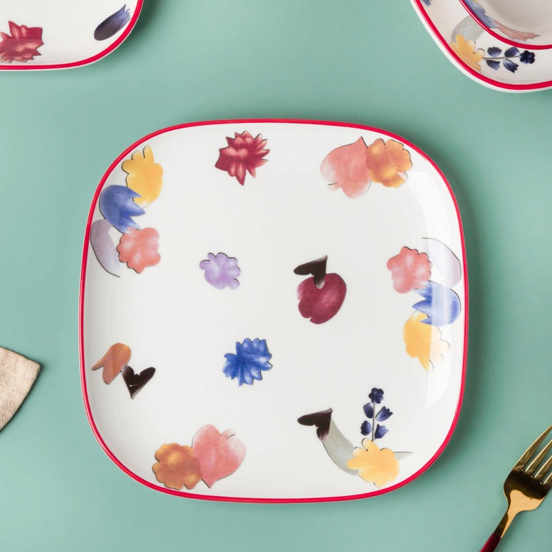 The vivid flowery square ceramic dinner plate adds a festive touch to the dining table arrangement. The square dinner dish, made of fine quality material, is conditioned with bluntly rounded corners. The colorful printed dinner plate is available in an abstract floral design, emanating a joyful radiance. The square ceramic dinner plate with a red, scarlet rim, provides a splash of color to any kitchen set. It may be utilized to serve the main meal while also elevating the dining table. It can be used as a breakfast plate, presenting an array of bread slices, fruits, cheese, ham, grilled bacon, and other elements of a delectable breakfast platter, or a plate for salads with croutons, which is an ideal cooler for the summer.