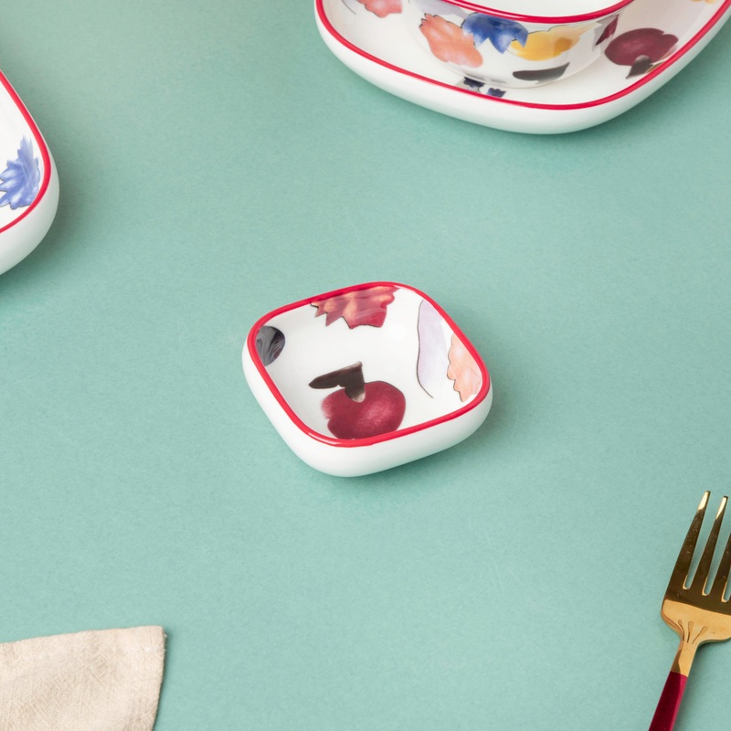 The glossed-surfaced dip bowl can also be used as a tiny dessert dish for mini servings. Place a tiny serving of pastry, brownie, cheesecake, or ice cream on the plate, along with a dessert spoon. The little patterned dish with a reddish rim can also be used to offer after-meal refreshments or mouth fresheners to visitors at the dinner table. The white and red ceramic patterned dish or bowl has appealing patterns drawn inside to give it a modern charm. It may also be used as a saucer or a little dish to hold nuts like almonds and resins, as well as pastries and biscuits.