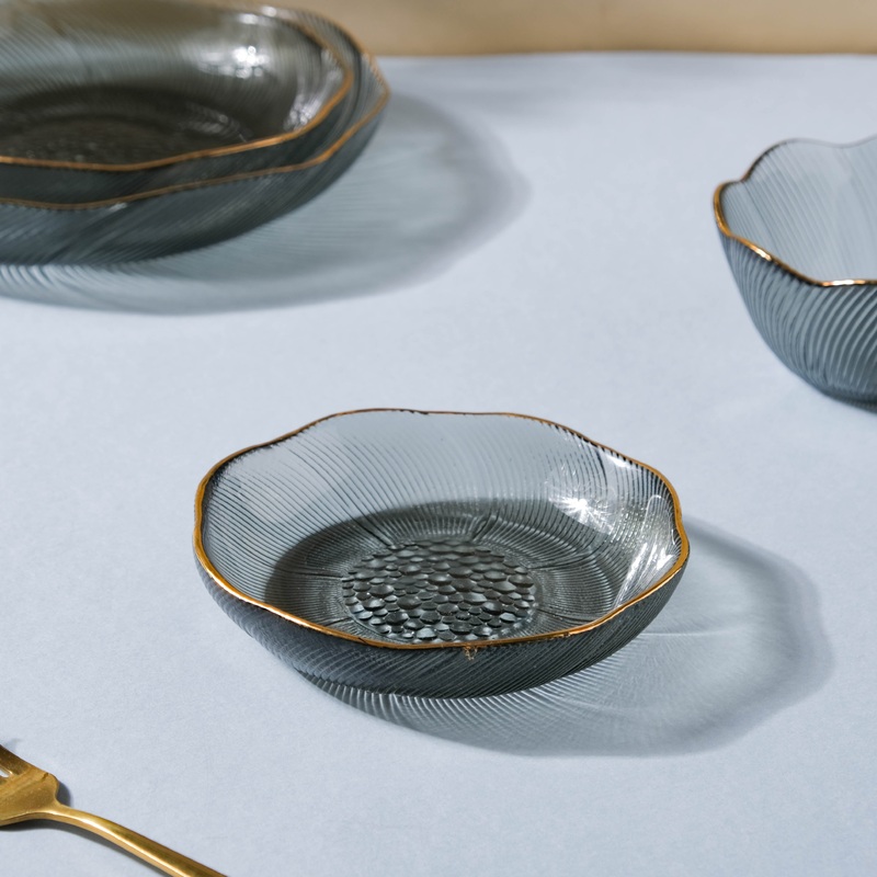 The dessert plate has been made with high-quality glass so that one can eat their favorite dessert with elegance. The plate has a multitude of textures on its base and outer surface, adding to its contemporary design. The plate dons a wavy rim that is coated in lustrous gold. Serve lip-smacking desserts like brownies, ice cream, pastries, and puddings.
