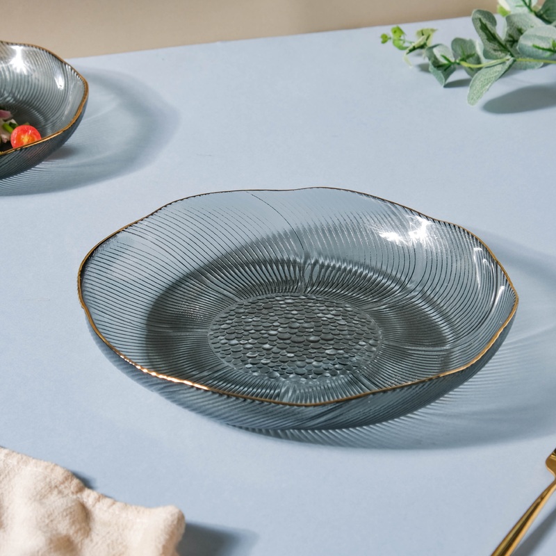 The transparent glass plate suitable for both formal and informal meals is an ideal addition to one’s dinner set collection. The plate has a golden rim and a textured base. The raised rim enables one to eat gravy dishes or delicacies such as pasta, and lasagna with ease.