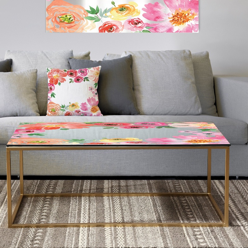 Revive your living room decor with this ‘Garland Vivid 13’ coffee table by Designart. Decorated with a garland of flowers in fresh, vibrant colors, this table brings an energetic feeling to your space. The artistic style matches a traditional home, and the sleek goldtone base adds a warm, glamorous twist.