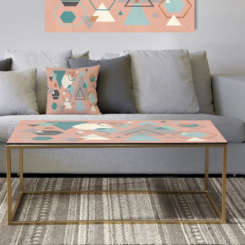 Bring depth and color to neutral seating areas with the attractive geometric pattern on this Designart coffee table. With the printing on the lower side of the glass top, this table's upper surface offers a wide smooth area for serving guests or playing ga