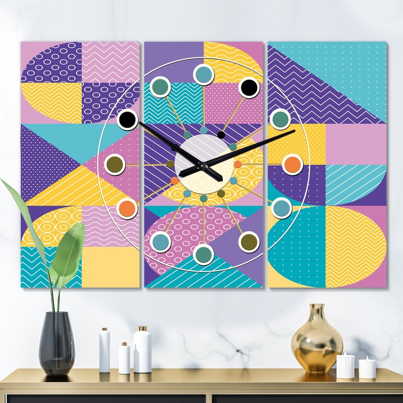 A beautiful addition to any home or office, this Mid-Century 3 panels wall clock is made on 100% solid aluminum. It has a highly reflective glossy finish creating a sleek modern look. This Geometrical Pastel Abstract I wall clock arrives completely ready to hang on the wall. Simply insert the “AA” battery included with your order.