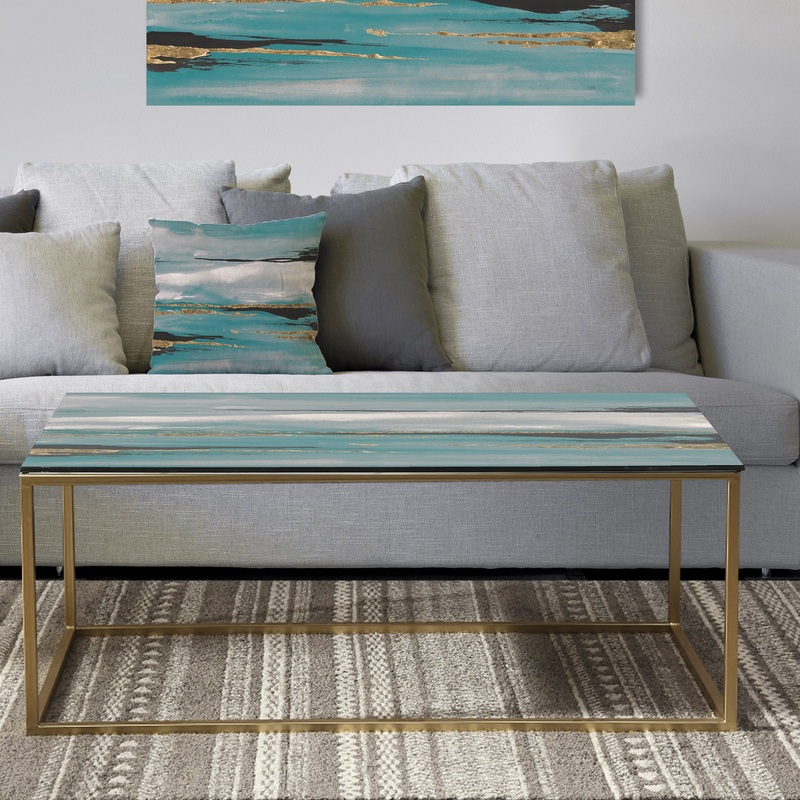 Amplify the nautical theme of your decor when you place this ‘Glam Teal Watercolor I’ coffee table in your living area. An abstract pattern is printed with high-density Italian ink on the underside of this table’s glass top to help it retain its vibrant hues. This table has a sled-style base crafted from durable metal with a gold finish for added flair.