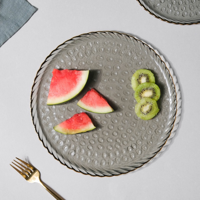The glass dinner plate makes for an elegant addition to the tablescape. The plate has a raised rim which enables one to eat gravy dishes or delicacies like pasta, lasagna, and gravy noodle. The plate has a textured outer surface, giving the glassware a stunning look and feel. The plate dons a golden rim that livens up the table setting.