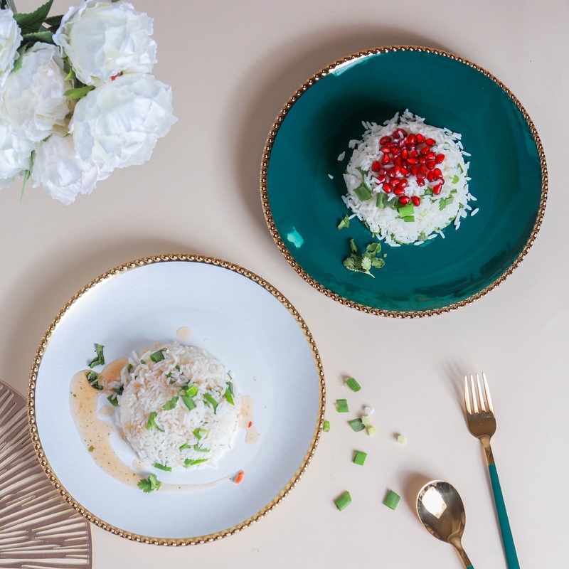 Treat guests and family to a royal dinner in the glazed ceramic dinner plates. The ceramic dinner plate in two elegant color variants will lend an aristocratic touch to the dinner table. Each plate is perfectly sized to serve the main course of either lunch or dinner. The dinner plate can be used to serve baked chicken with fried rice and sauted vegetables to the guests. The cool-toned plate is perfect for serving any vibrant colored main course.