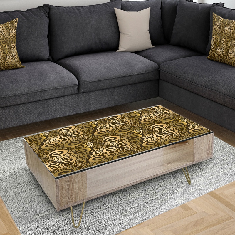 Highlight basic, bold contrast with this ‘Gold and Black Swirl I’ coffee table by Designart. This table’s two-tone palette complements a wide variety of color schemes, with a solid glass top that doubles as a work of art. Hairpin metal feet and a sturdy frame give this table high durability and modern appeal.