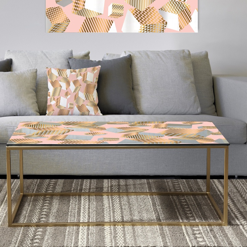 Glam up your living room with the luxurious color scheme featured on this ‘Gold and Rose Cubes I’ coffee table from Designart. A golden rectangular metal frame holds up the glass top while ink deposited on the bottom side protects the image from cups and saucers sliding around on top.