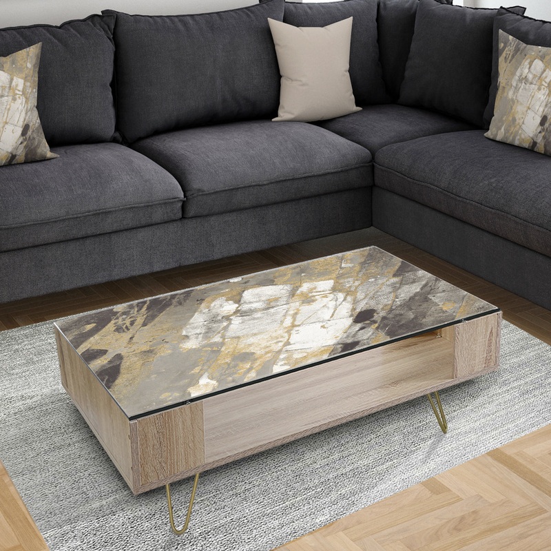 Enjoy the unique beauty and practicality of this rectangular coffee table featuring an open storage space that’s accessible from either side. A glass top protects a handpainted gold, black, and white abstract pattern from damage, and hairpin legs offer strong support and height.