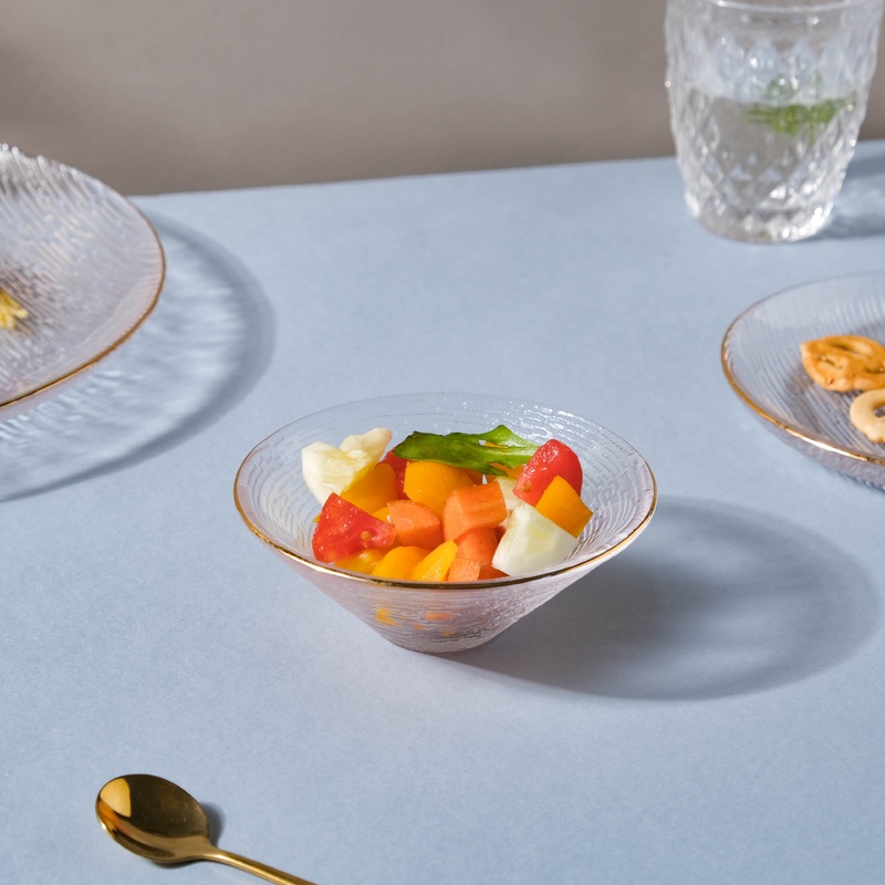 Serve delectable desserts, sweets, and ice-creams in the textured wide bowl. The dessert bowl features a conical shape with a wide mouth and a smaller base that is both attractive and functional. The glass bowl with a golden rim will make treats look even more appealing. They are great for everyday use to serve nuts, mouth fresheners, and also make a great addition to the table setup when a party is being planned.