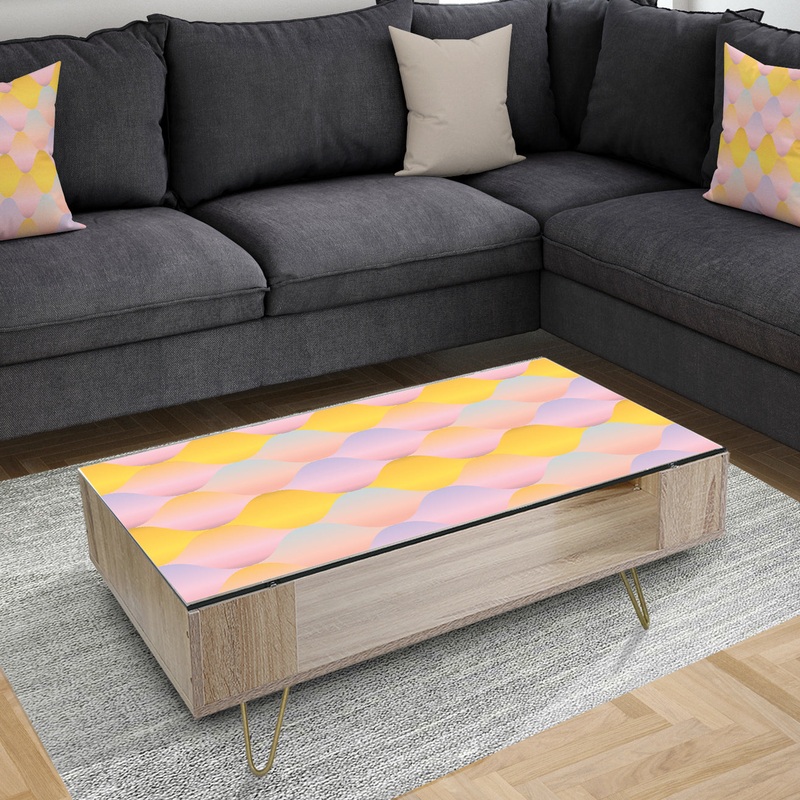 Lend a vibrant vibe to your living room with this ‘Golden Geometrical Diamond Pattern’ coffee table from Designart. A stunning geometrical pattern printed with high-density Italian ink underneath the glass top is highly durable and fade-resistant. With a open shelf for additional storage space, this table boasting metal hairpin legs is sturdy and stable.