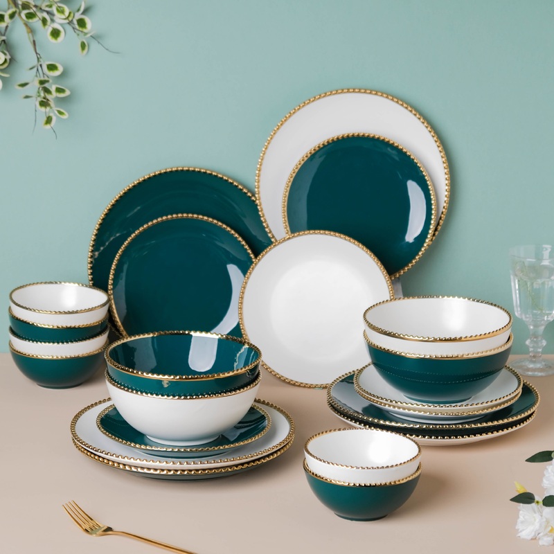 Hosting a housewarming or a traditional event is made convenient by the attractive and exclusive Elysian collection of crockery suitable for lunch and dinner setups. The tempting green and white dinner set comes with a luxurious assortment of bowls and plates to ensure that every service is a slice of heaven. Along with the refinement of the glossy neutral tones, the golden rim exudes elegance and refined beauty. Three green dinner plates, three white dinner plates, three white appetizer plates, three green appetizers plates, three white soup bowls, three green soup bowls, two white serving bowls, and two green serving bowls make up this lovely set. Alternatively, the serving bowls can also double up as salad bowls.
