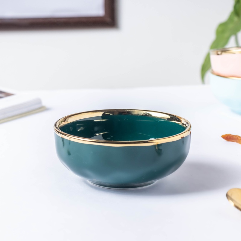 The bottle green bowl comes with a glazed-finish which lends a classy aesthetic to the modern and contemporary dinner set-up. The ceramic bowl is embellished with a gold rim which accentuates the aristocratic appeal. For a house party or a social get-together, bring home a few ceramic bowls to serve soups and stews to guests. Serve homemade dips along with delectable munchies in the Greenwave Ceramic Dip Bowl.