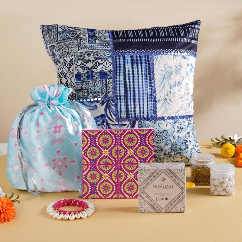 Nestip: The cushion cover from the wedding hamper can be used to adorn the living room couch and make it look more welcoming and cosy.