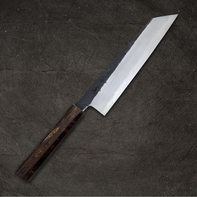The Gyuto (lit. Cow Sword) is an adaptation of the French chef knife profile for the Japanese market. While the name cow sword would imply that this knife is meant only for meat, its versatility is the same a santoku and can be used as a general-purpose knife for any task. Many would consider a gyuto or chef’s knife to be the one essential knife for any kitchen with all other knives being secondary. Compared to a German style chef’s knife, a gyuto will have a somewhat flatter profile: this profile lends itself well to push-cutting which is common for Japanese chefs, as opposed to rock-chopping. Gyuto also tend to be thinner at the edge as well as the spine than most European chef’s knives and as a result have less lateral toughness and care should be taken not to torque the blade while cutting to minimize the risk of chipping.