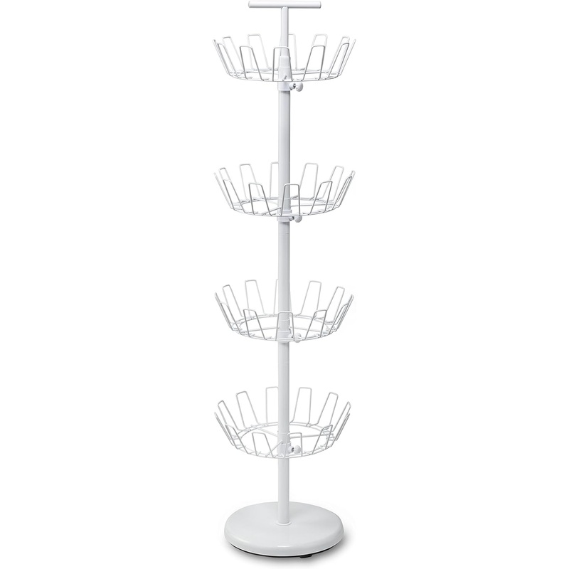 Honey-Can-Do SHO-01197 Shoe Tree with Spinning Handle, White, 4-Tier. 49-inches tall, 11.4-inches long and 11.4-inches wide. Holds up to 24 pairs of shoes; assembly instructions included. Tiers are removable so you can add/remove tiers as needed for your needs. Revolving 4-tier shoe tree made of heavy-duty chromed steel. Weighted bottom ensures stability. Holds heels, boots, sneakers, sandals, peep-toe pumps, trainers, galoshes, high-tops, loafers, moccasins, mules, slippers, and platform, tap, and skate shoes. Home organization made easy!