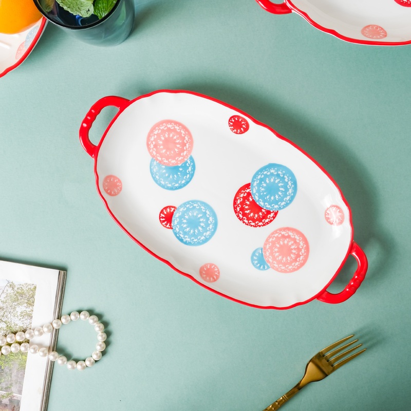 Appetizer plate with a white surface and colorful motifs comes with red handles for easy handling. The side plate has a slightly raised rim with an intricate design that makes the plate stand out. Use the ceramic appetizer plate as a side plate for serving bread with the main course, as a starter plate, as a snack plate, or as a plate to serve buns along with a soup serving. The plate can elevate any table setting and food that is served in it.
