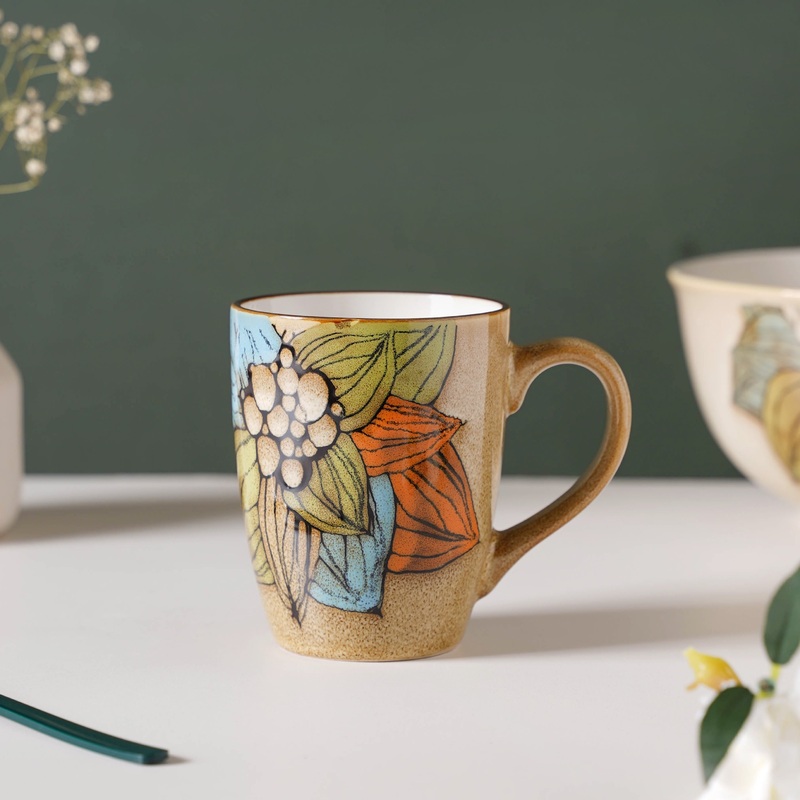 The multicolored ceramic mug with bright florals has a brilliant ceramic glaze to enhance the coffee-time experience. The ceramic mug brings a splash of color to any table with its vibrant hues. The microwave-safe cup can be used for reheating beverages such as milk and tea.