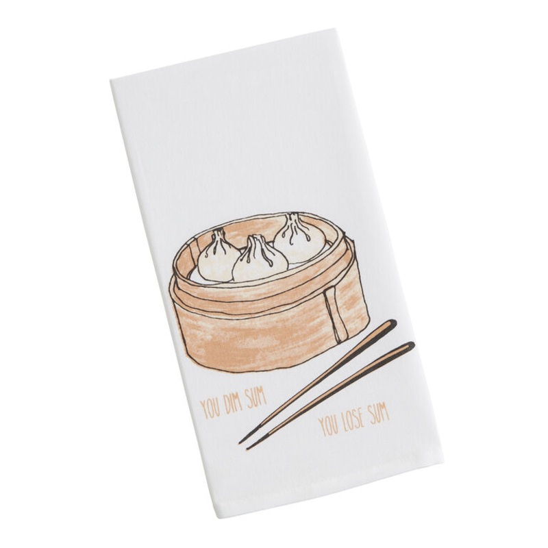Handy and cheerful additions to your kitchen, our exclusive tea towel is decorated with illustrated artwork and cheeky puns. Choose from an array of fun food and drink designs including dim sum, mushrooms, tomatoes and martinis. Made of soft, absorbent cotton, this charming kitchen towel is perfect for wiping down counters and drying dishes.