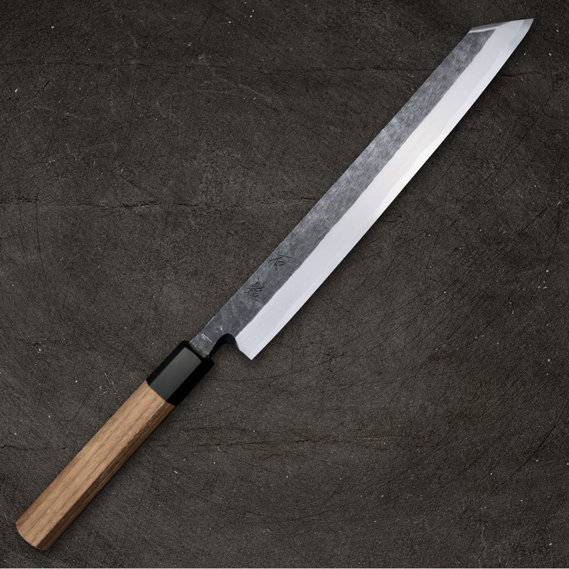 Yanagiba (lit. willow blade) is an essential tool for sushi chefs. The name Yanagi refers to the willow-leaf shape of the blade as opposed to it necessarily being a single bevel. Some knife makers have been known to refer to Sujihiki made with a willow shape as Yanagi. In common parlance, however, Yanagi or Yanagiba is understood to mean a willow-shaped knife ground with a single bevel. These knives are one of the three traditional Japanese knives, along with Deba and Usuba, that were historically requisite for the creation of Japanese cuisine. It is primarily used for slicing sashimi or delicate cuts of other soft proteins. Its hollow-ground backside, known as the Ura, helps facilitate the release of fish as it is sliced and ensures that an extremely low inclusive edge angle may be maintained. The Yanagi is the fish slicer traditionally used in the Kansai region of Japan (Osaka and Kyoto). There are many variants of Yanagi including Kensaki (sometimes called kiritsuke-tip), Takohiki (octopus knife), Fuguhiki (blowfish knife) and Sakimaru Takohiki (round-tipped octopus knife)