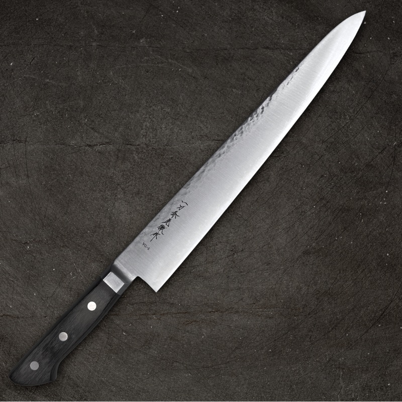 DetailsStyle: Sujihiki (Slicing Knife)Length: 270mm (10.6")Weight: 7.1 oz (203g)Blade Steel Type: VG-5Handle Material: Resin-Treated Compressed WoodHRC: 58-59Bevel Angle Ratio: 50/50Special Feature: Hammered (Tsuchime) pattern near the spine gives good foo