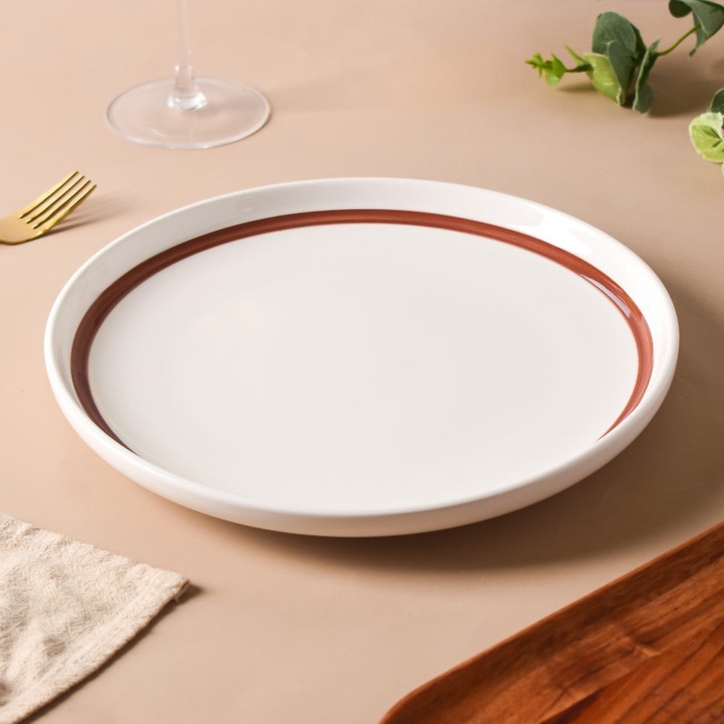 Create a striking yet soothing ambiance on the table with the ceramic dinner plate. The ceramic plate features an ivory white colour with a soothing brown rim that adds depth to the form of the ceramic plate. Featuring a glazed finish, the ceramic plate with a blend of modernistic and earthy vibe will surely enhance the table setup.